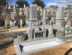 作業当日は梅雨の晴れ間の猛暑にもかかわらず早朝から作業していただき、完成したお墓は図面で見る以上に立派なもので家族全員喜んでおり、良い先祖供養になりました。